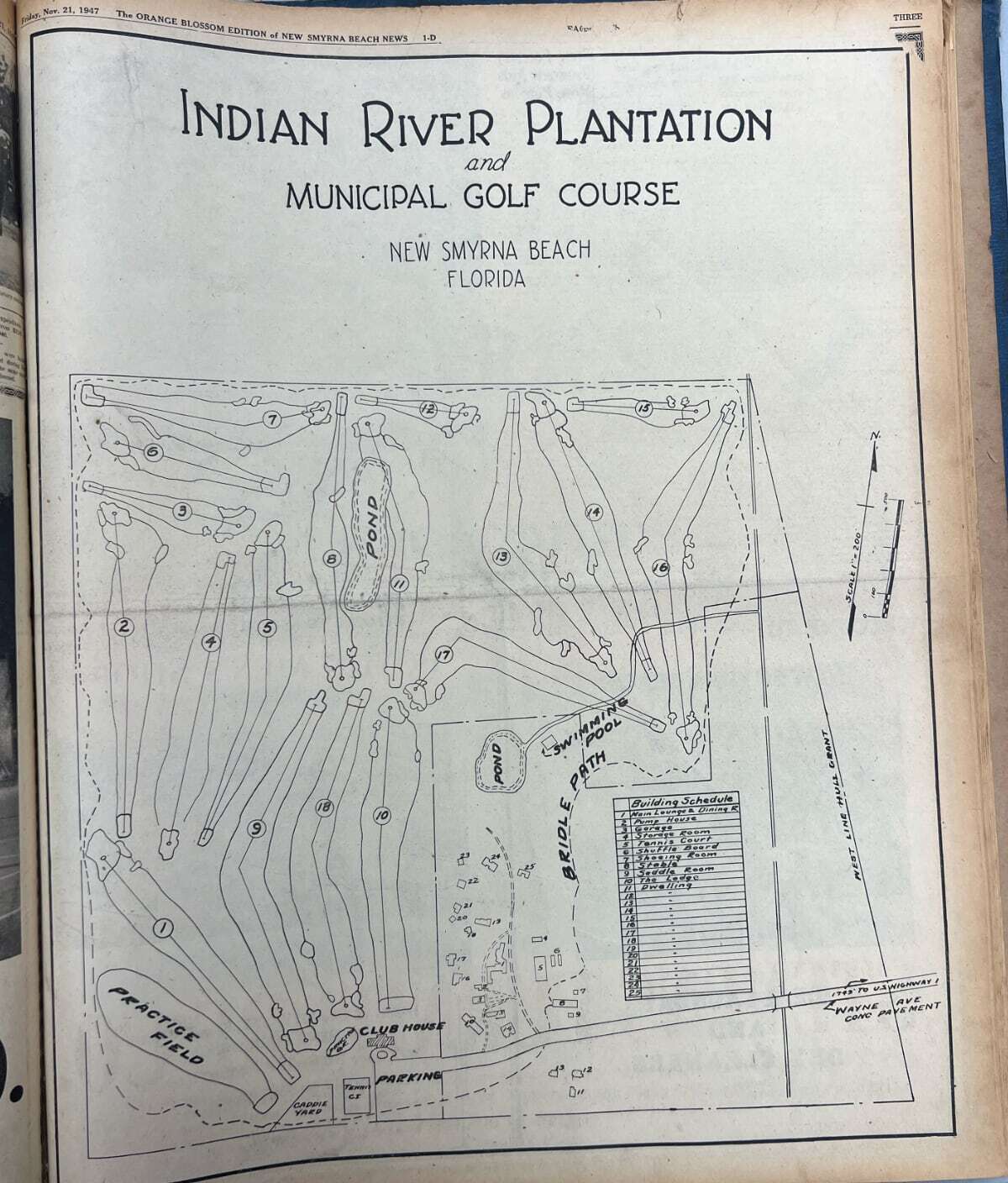 During negotiations with the city over transfer of the property, a drawing showing the layout of the proposed “Indian River Plantation and Municipal Golf Course” was published in New Smyrna Beach News. It shows the clubhouse roughly where it is today, plus a bridle path around the periphery of the course. The resort’s pool, cabin and other facilities are shown tucked in the southeast corner, roughly where the Indian River Plantation neighborhood is today.